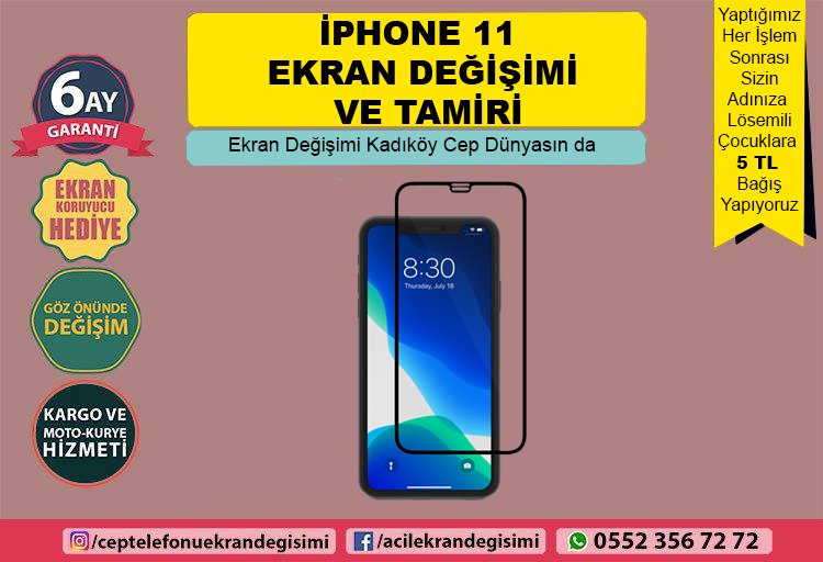 iPhone 11 Ekran Değişimi işlemi firmamızda maksimum 30 dakika gibi bir zamanda göz önünde yapıp teslim etmekteyiz. Her akıllı cep telefonunda olduğu gibi iPhone 11 modelleri de ekran konusunda benzer sorunlara maruz kalabiliyor. Çeşitli nedenlere bağlı olarak ortaya çıkan ekran problemleri ise genelde değişim yapılarak çözüme ulaştırılıyor. Ekran değişimi ile telefonda yaşanan dokunmatik panel sorun ve bunun yanında kırılma ya da çatlama gibi problemlerin giderilmesi mümkün oluyor.